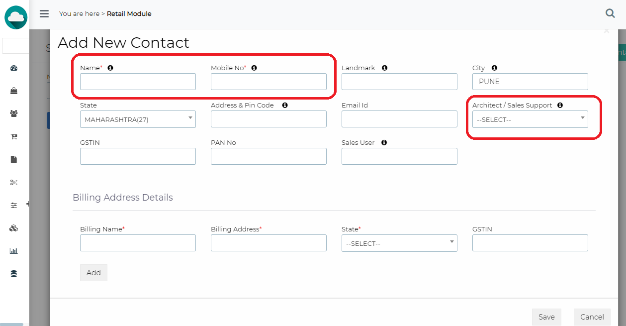 You need to fill just the name and mobile number of the customer. Does your customer come recommended from an Architect. Select the name of the architect from the drop down available.