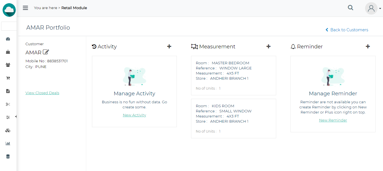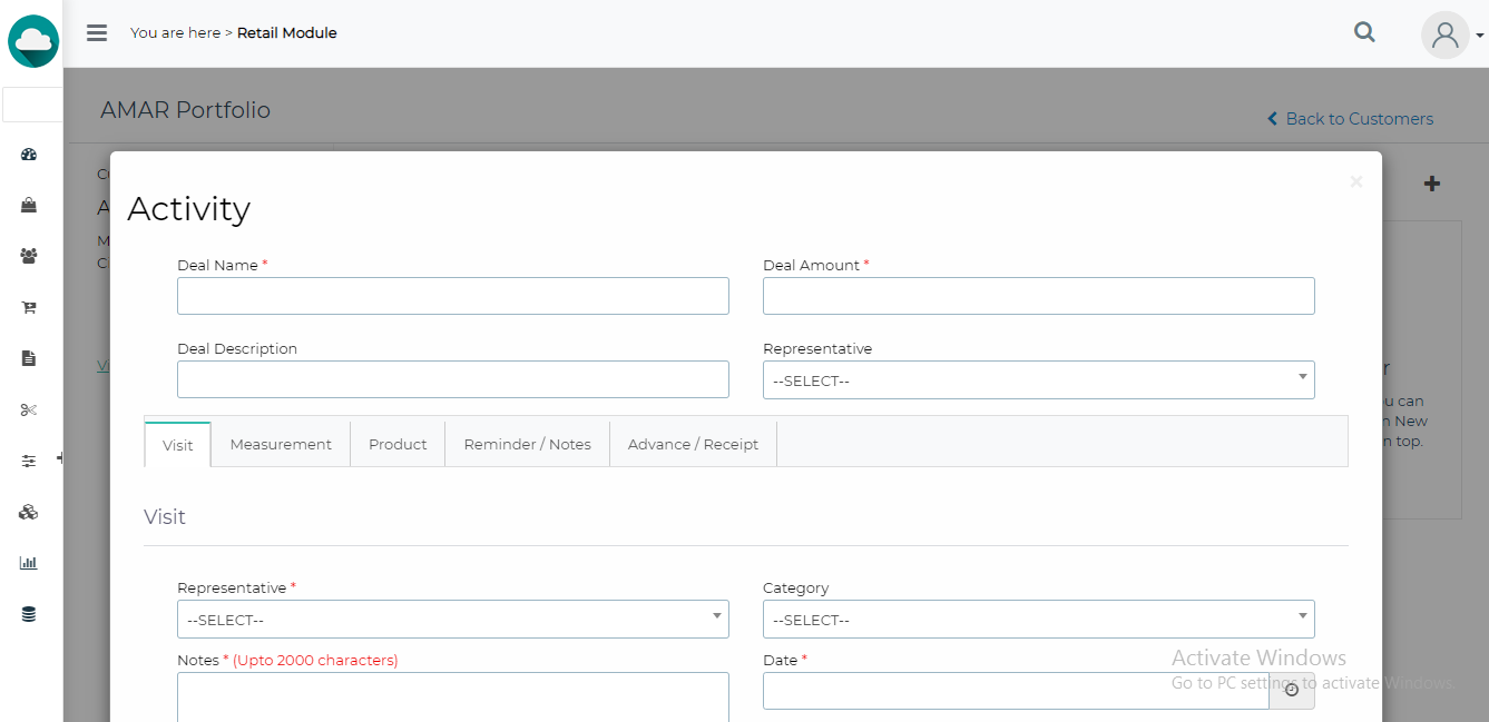 You can have various interactions with the customer during a deal which could vary from, shortlisting products, planning visits, taking measurements, collecting payments, taking notes and reminders and many more activities.